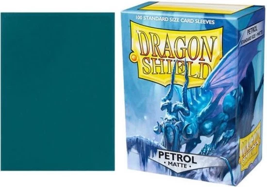 Clear front & Petrol back. Darker than turquoise and heavier than gas.??Matte sleeves are our popular line of textured Dragon Shield with superior handling. A perfect mix of durability and shuffle-ability.??100 sleeves per box. For cards measuring up to 63??88 mm (2?????x3?????). PVC-free polypropylene sleeves, no acid. Archival safe. 120 ?? quality thickness. Sturdy cardboard box fits 75+ sleeved cards. Box lid has a label for your personal use. Designed for use with Magic the Gathering???, Pok??mon??? and other card games.