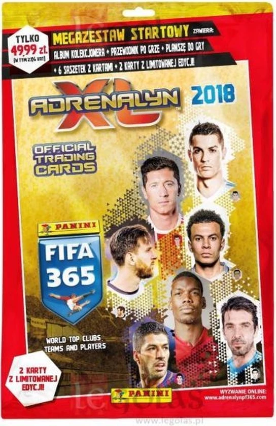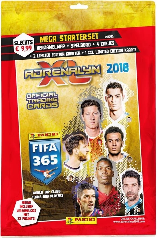 Panini’s Adrenalyn XL FIFA365 voetbalkaarten starterset. Deze starterset bevat o.a. 1 verzamelmap, een spelbord, 4 boosterpacks, 2 Limited Edition kaarten + 1 XXL Limited Edition kaart
