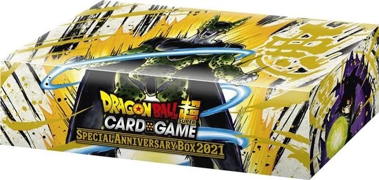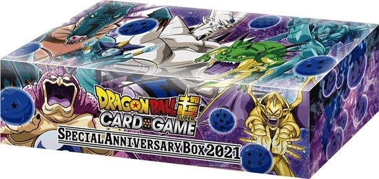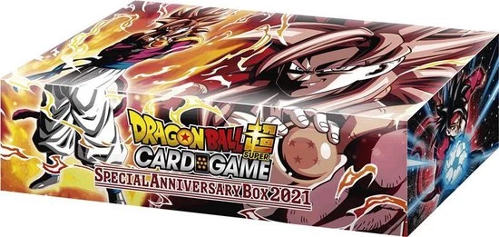 Vier de verjaardag van Dragon Ball Super Card Game met ons! Speciale jubileumdoos 2021 van dit ongelooflijke kaartspel met de speciale jubileumset 2021 met 35 nieuwe kaarten x 2 (in totaal 70 inbegrepen in het pakket), 2 speciale jubileumpakket 2021-enveloppen met elk 4 foliekaarten (36 + 1 geheime in totaal willekeurig), 4 Vault Power Up Pack 2021-pakketten (16 verschillende die willekeurig uitkomen, elk pakket bevat 3 normalen en 1 folie / goud), 1 set van 66 sleeves (Er zijn 4 verschillende ontwerpen willekeurig) en 1 opbergdoos (4 verschillende ontwerpen willekeurig).