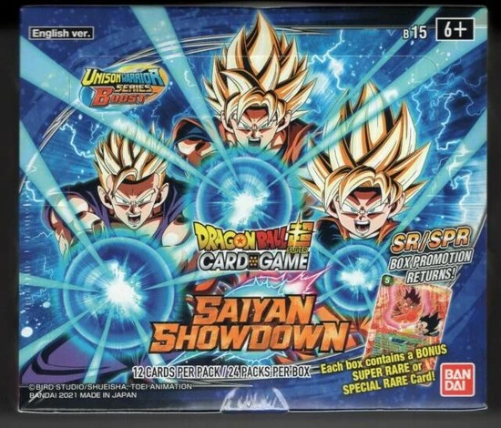 Een Dragon Ball Z – Saiyan Showdown Booster Box bevat 24 boosterpacks