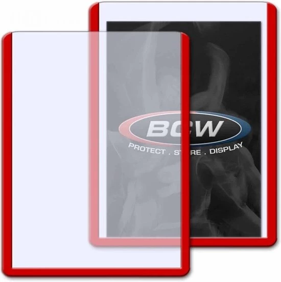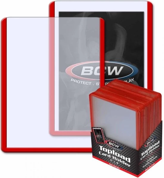 BCW toploaders zijn de meest populaire toploaders in de Verenigde Staten. De toploaders zijn van stevig PVC van hoge kwaliteit. Dit product is handig voor het beschermen, opslaan of versturen van kaarten. Deze harde sleeves zijn geschikt voor Pokemon, Magic The Gathering, YuGiOh en sportkaarten. Deze toploaders hebben een rode rand. Wordt geleverd in doos van 25 stuks.