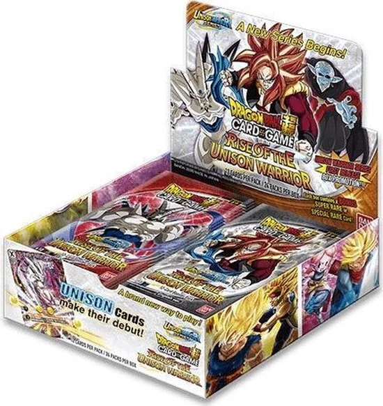 Dragon Ball Super – Rise of the Unison Warrior S10 boosterbox met 24 boosterpacks. In een boosterpack zitten 12 random kaarten van de 292 verschillende type kaarten.