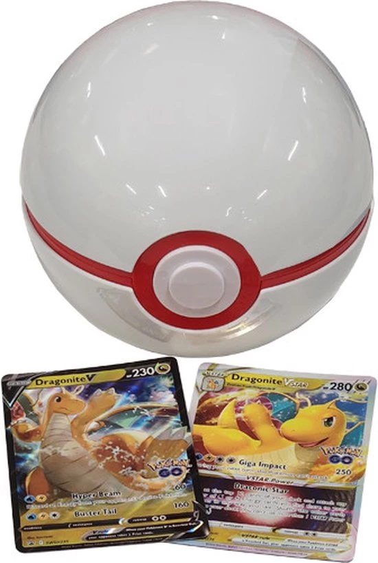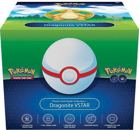 | Verpakkingsinhoud | Inhoud:, 1, promokaart, met, Dragonite, VSTAR, 1, promokaart, met, Dragonite, V, 1, dekhouder, in, de, vorm, van, een, Premier, Ball, 9, Pokémon, GO, boosterpacks, Een, codekaart, voor, Pokémon, TCG, Live |
