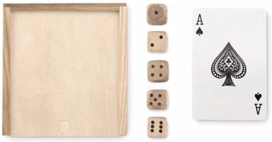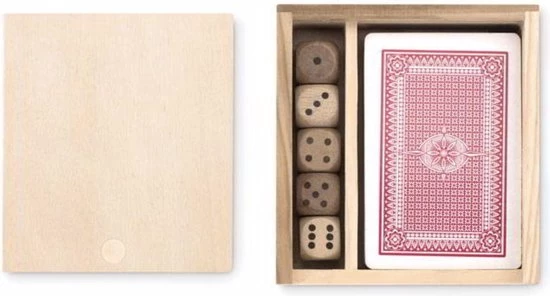 Luxe Professioneel kaartenspel in een handig houten opbergdoosje voor het goed bewaren van de kaarten en dobbelstenen. Degelijke kwaliteitskaarten om uren speelplezier te beleven. Ook geschikt voor poker omdat deze kaarten geplastificeerd zijn gaan deze jaren mee.