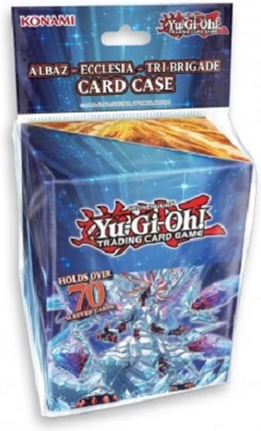 The Yu-GiOh! TRADING CARD GAME (TCG) Albaz – Ecclesia – Tri-Brigade Card Case features the two ferocious, Dragon-Type Fusion Monsters from Structure Deck: Albaz Strike ? Mirrorjade the Iceblade Dragon and Lubellion the Searing Dragon! The ice blades and searing flames will not only guard your Deck from the outside, but also from the inside as they?re featured on the 2 -Sided Divider included with each Card Case.