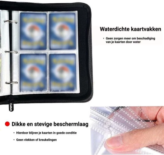 – KWALITEIT: De verzamelmap is gemaakt van premium kwaliteit materialen. De buitenkant is gemaakt van PU leer, kan tegen een stootje en is waterdicht. De rits is zeer duurzaam en kindvriendelijk. De speciaal ontworpen transparante 4 pocket insteekbladen zijn de kers op de taart. Je kan je verzameling kaarten makkelijk in de vakjes schuiven zodat deze zijn beschermd tegen stof en tegen beschadigingen.