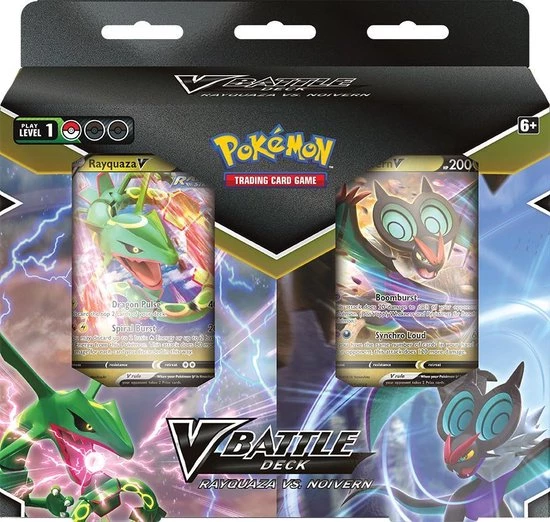 Verwelkom de Dragon-type Pokémon terug met twee Pokémon kaarten decks geleid door Rayquaza V en Noivern V! Rayquaza V combineert de krachten van Fire en Lightning en Noivern V kanaliseert Psychic en Darkness Energy krachten. Je kunt je afgedankte kaarten omzetten in damage en allerlei trucjes uit je mouw schudden met deze twee Battle Decks!