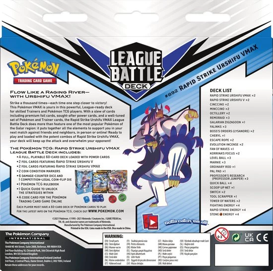 Sla duizend keer toe, elke keer een stap dichterbij de overwinning! Deze Pok?mon VMAX is van jou in dit krachtige League Battle Deck voor bekwame Pok?mon trainers en Pok?mon spelers. Met een groot aantal kaarten, waaronder premium foil cards, gewilde power kaarten en een goeie mix van Pok?mon en Trainer kaarten, bevat het Rapid Strike Urshifu VMAX League Battle Deck biedt meer dan alleen ??n van de meest populaire Pok?mon van de Galar regio: he deck brengt alle elementen samen die jij nodig heb voor de volgende strijd tegen buren en vrienden. Klaar om te spelen en voorzien van krachtige combos en Rapid Strike Urshifu VMAX, zal jouw deck ervoor zorgen dat jij je tegenstanders kan overvallen en de strijd kan winnen!