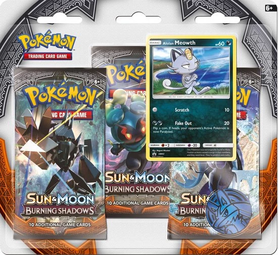 Deze Pok?mon TCG Sun & Moon Burning Shadows 3-booster blister bevat 3 booster packs, 1 losse kaart en een munt. Per booster zitten 10 kaarten inbegrepen.