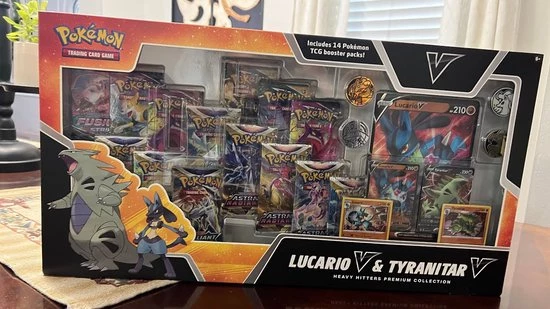 You’ll make a big impression in battle alongside powerful Pok?mon and expand your assortment of Pok?mon TCG cards with the Heavy Hitters Premium Collection! In this box, you’ll find ready-to-play foil cards featuring Lucario V, Tyranitar V, Lucario, and Tyranitar, plus an oversize foil version of Lucario V for display along with a set of four shimmering coins. To top it all off, a stack of 14 booster packs (that’s 140 total cards!) helps ensure you have plenty of options for creating your next awesome deck.
