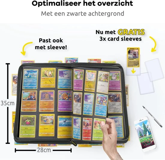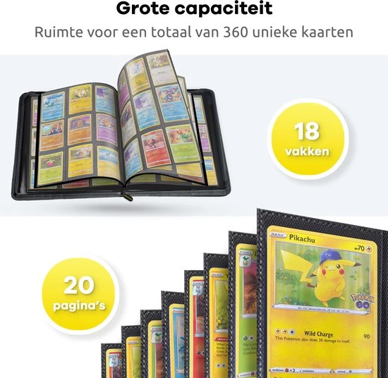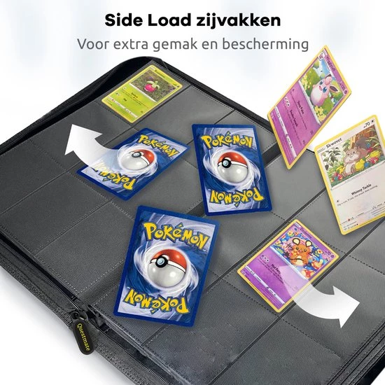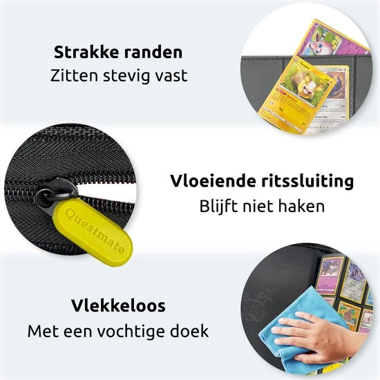 Naast het feit dat de Verzamelmappen dubbelzijdig zijn, kun je jouw lievelingskaart gemakkelijk vinden onder andere dankzij de zwarte achtergrond van jouw gloednieuwe portefeuille. Van laag naar hoge HP, Pokémon evaluaties of in energie ordenen? Doe het op jouw manier met de luxe Questmate Verzamelmap!