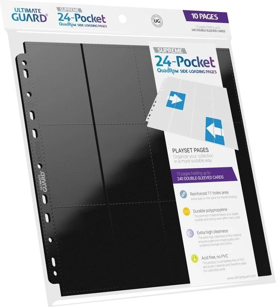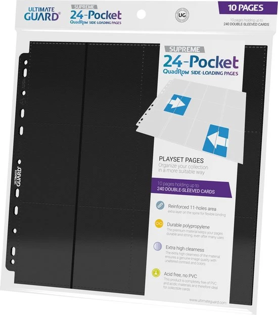 High-quality, double-sided pocket pages (24 pockets, 12 pockets each on front and back side) with a double reinforced 11-hole strip. Each pack contains 10 pages for storing and carrying at least 240 double-sleeved cards (24 per page).