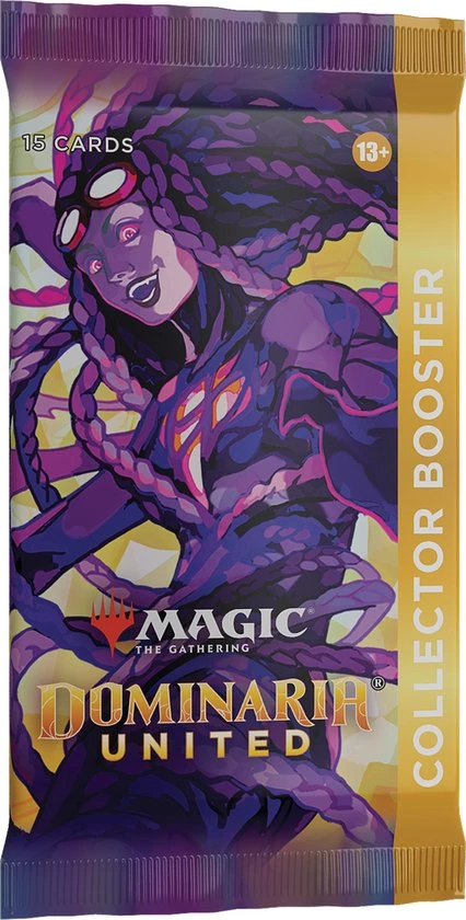 De Dominaria United Collector Booster bevat 15 Magic: The Gathering-kaarten en 1 Traditional Foil dubbelzijdige token, met een combinatie van 5-6 kaarten van zeldzaamheid Rare of hoger en 4-5 Uncommon, 4 Common en 1 Land-kaarten, met een totaal van 10-13 foliekaarten. Folie Borderless Mythic Rare Planeswalker in 2% van de boosters