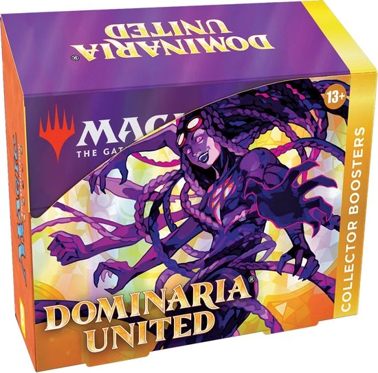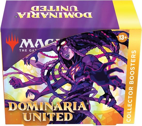 The Dominaria United Collector Booster Box contains 12 Dominaria United Collector Boosters and 1 Traditional Foil Box Topper card.