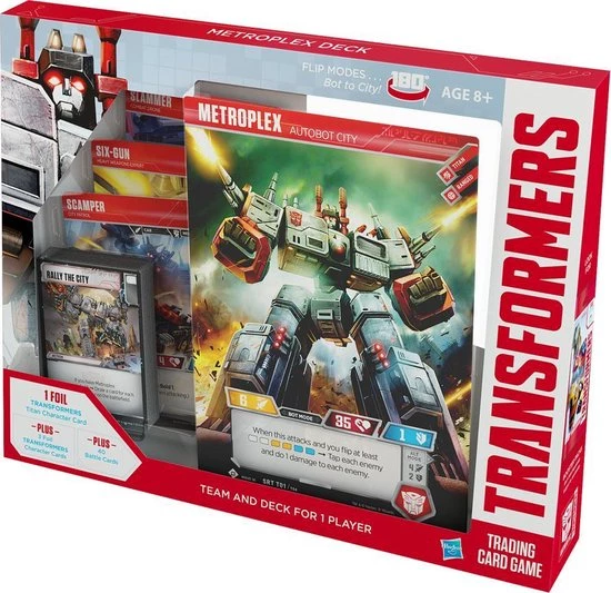 | Verpakkingsinhoud | Dit, Metroplex, deck, bevat, 1, Titan-sized, foil, dubbelzijdige, Transformer, Metroplex, 3, oversized, foil, Transformers, een, battle, deck, met, 40, kaarten, en, spelregels. |